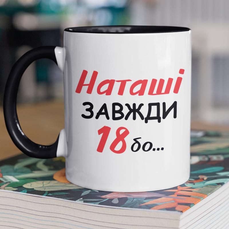 Чашка керамічна з принтом "наташі завжди 18" 330 мл, біла з чорною ручкою