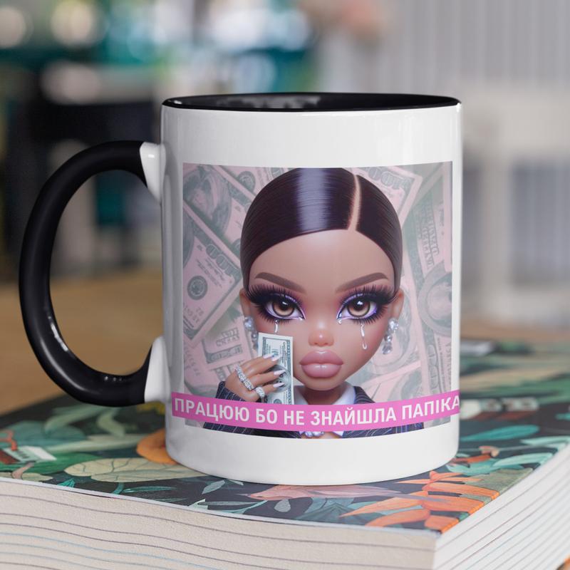 Чашка керамічна з принтом "працюю бо не знайшла папіка" 330 мл, біла з чорною ручкою