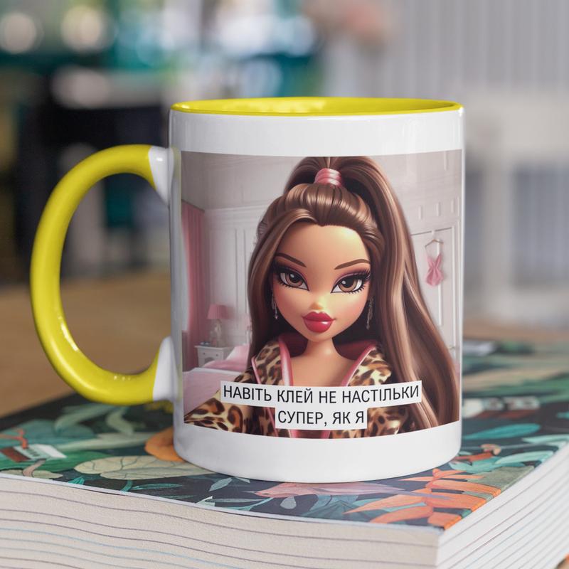 Чашка керамічна з принтом "клей не настільки супер як я" 330 мл, біла з жовтою ручкою