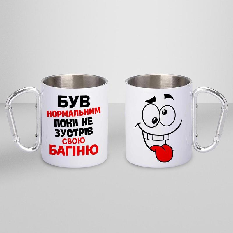 Чашка металева з принтом "був нормальним поки не зустрів багіню" 300 мл з карабіном, біла
