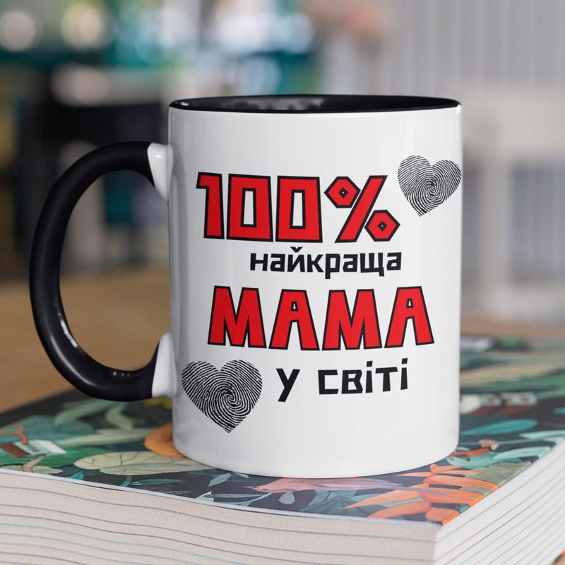 Чашка керамічна з принтом "100 % найкраща мама" 330 мл, біла з чорною ручкою
