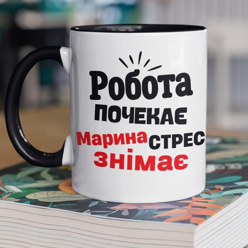 Чашка керамічна з принтом "марина стрес знімає" 330 мл, біла з чорною ручкою