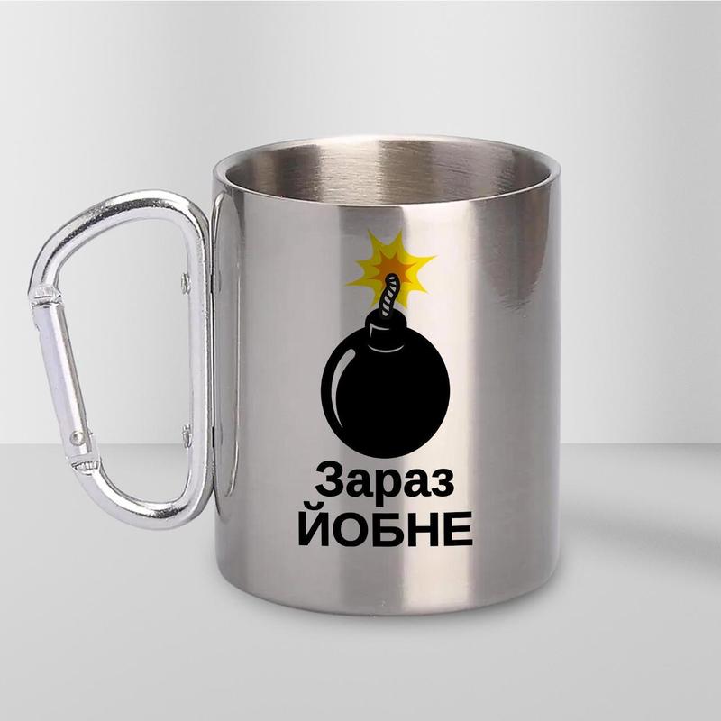 Чашка металева з принтом "зараз йо*не" 300 мл з карабіном, срібляста