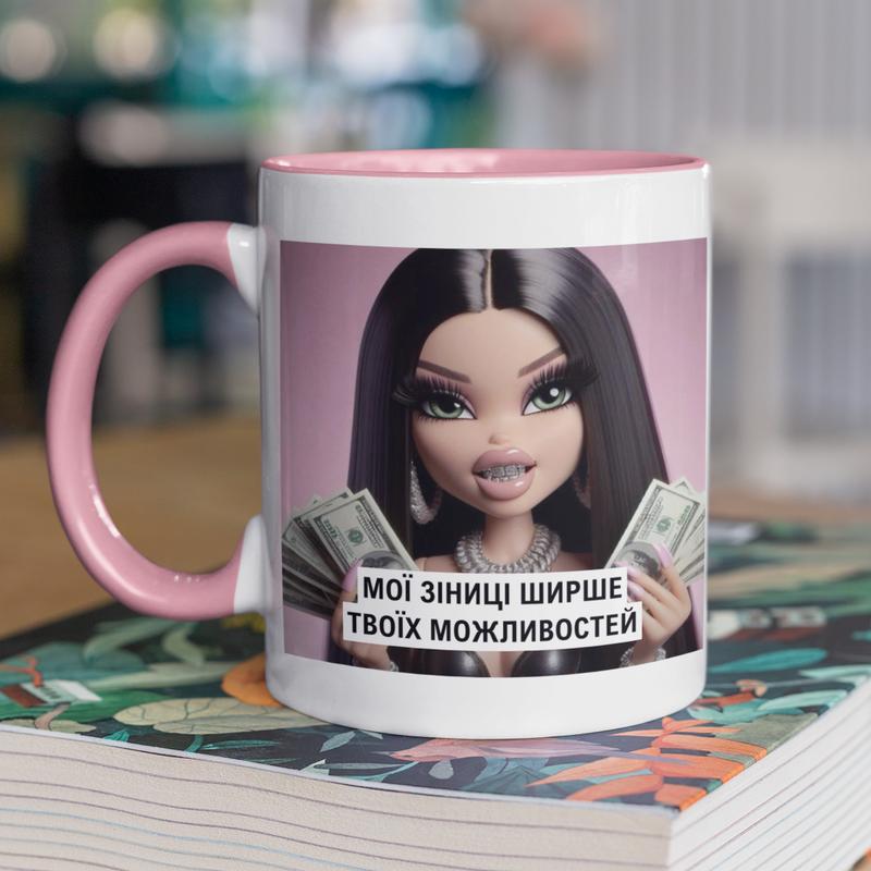 Чашка керамічна з принтом "мої зіниці ширше твоїх можливостей" 330 мл, біла з рожевою р...