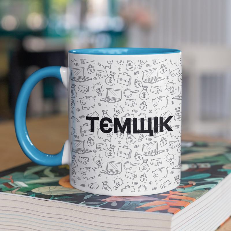 Чашка керамічна з принтом "тємщік" 330 мл, біла з блакитною ручкою