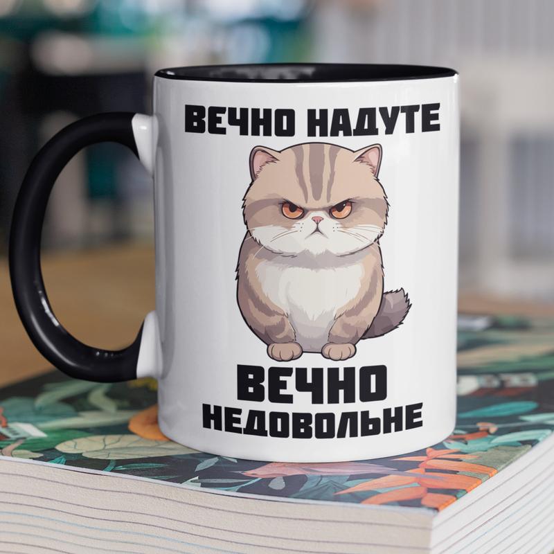Чашка керамічна з принтом "вєчно недовольне" 330 мл, біла з чорною ручкою