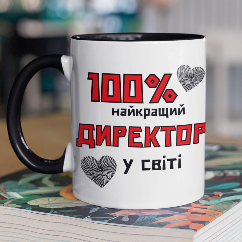 Чашка керамічна з принтом "100 % найкращий директор" 330 мл, біла з чорною ручкою
