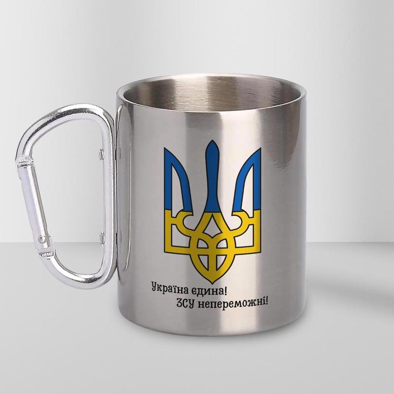 Кружка металева з карабіном "герб україна єдина" 300 мл срібляста