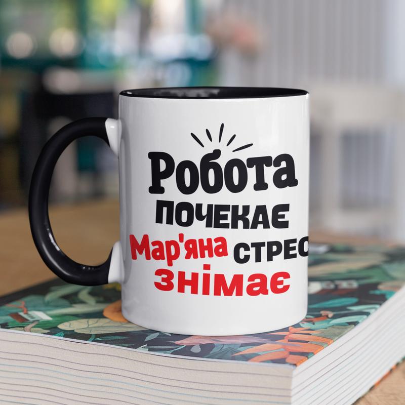 Чашка керамічна з принтом "марʼяна стрес знімає" 330 мл, біла з чорною ручкою