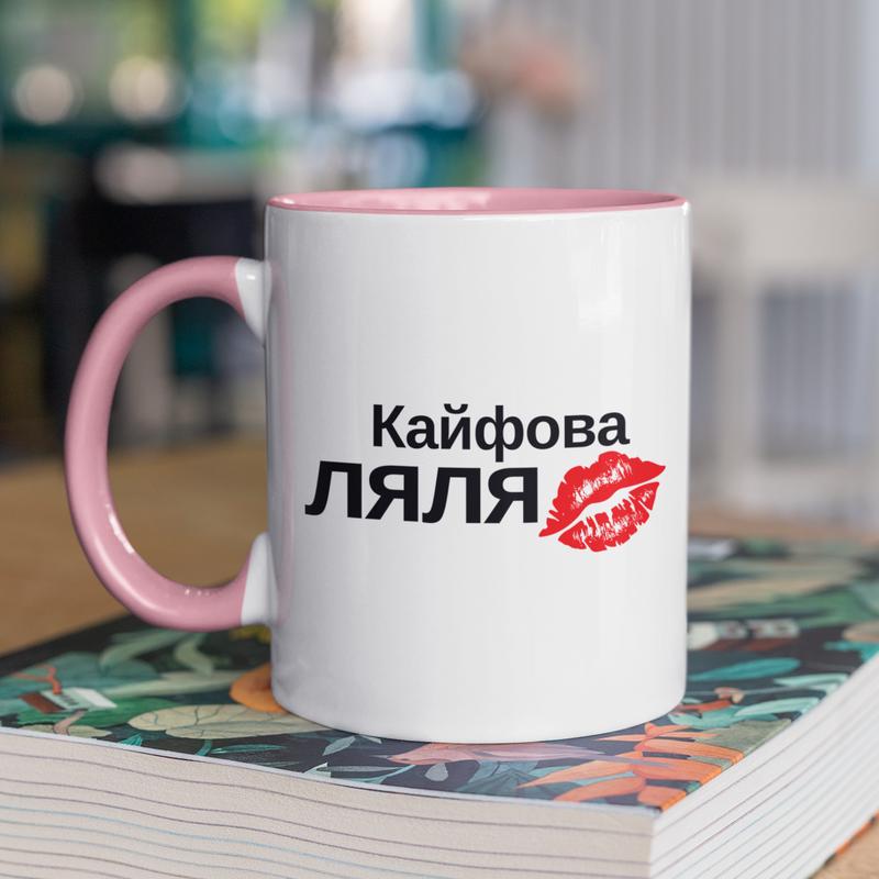 Чашка керамічна з принтом "кайфова ляля" 330 мл, біла з рожевою ручкою