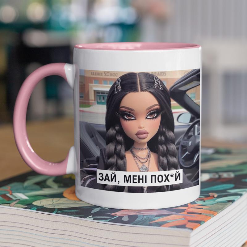 Чашка керамічна з принтом "зай мені пох*й" 330 мл, біла з рожевою ручкою