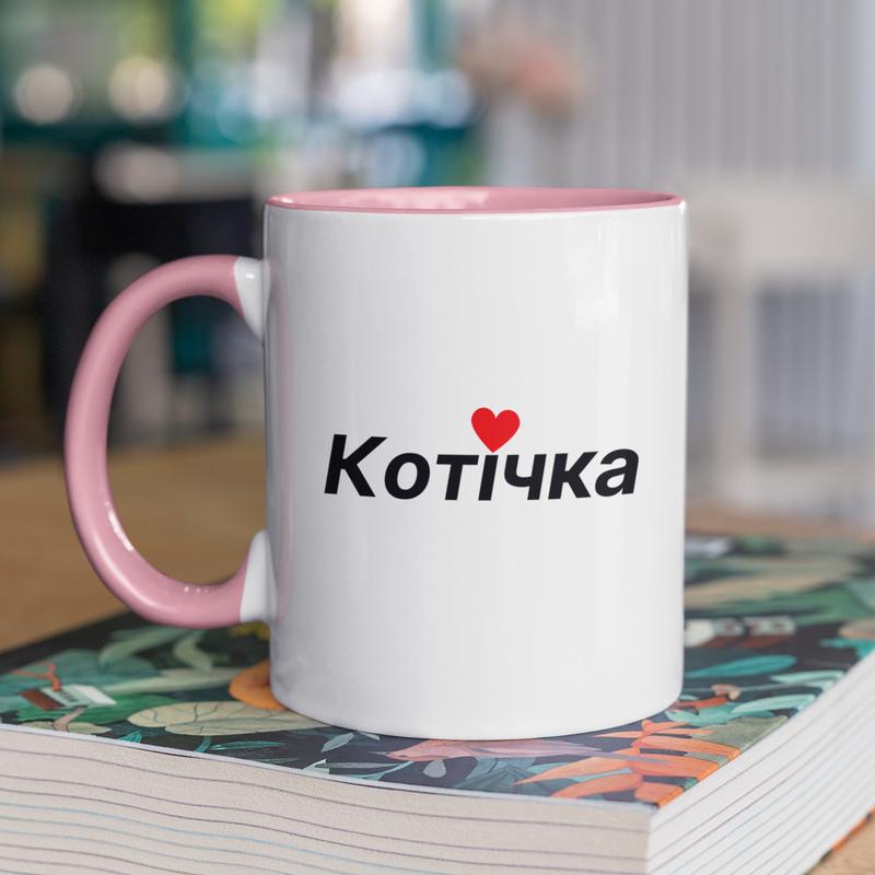 Чашка керамічна з принтом "котічка" 330 мл, біла з рожевою ручкою