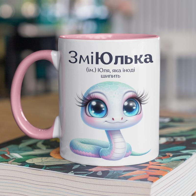 Чашка керамічна з принтом "зміюлька" 330 мл, біла з рожевою ручкою