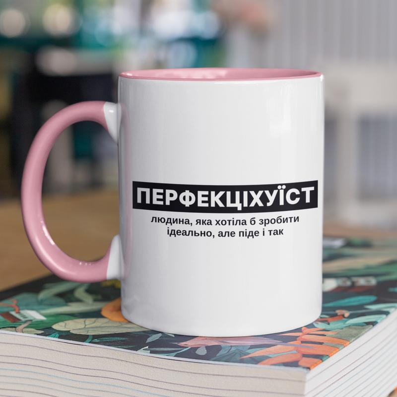 Чашка керамічна з принтом "перфекціхуїст" 330 мл, біла з рожевою ручкою