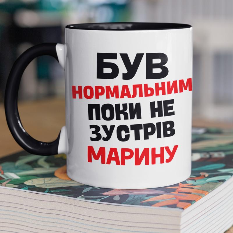 Чашка керамічна з принтом "був нормальним поки не зустрів марину" 330 мл, біла з чорною ру...