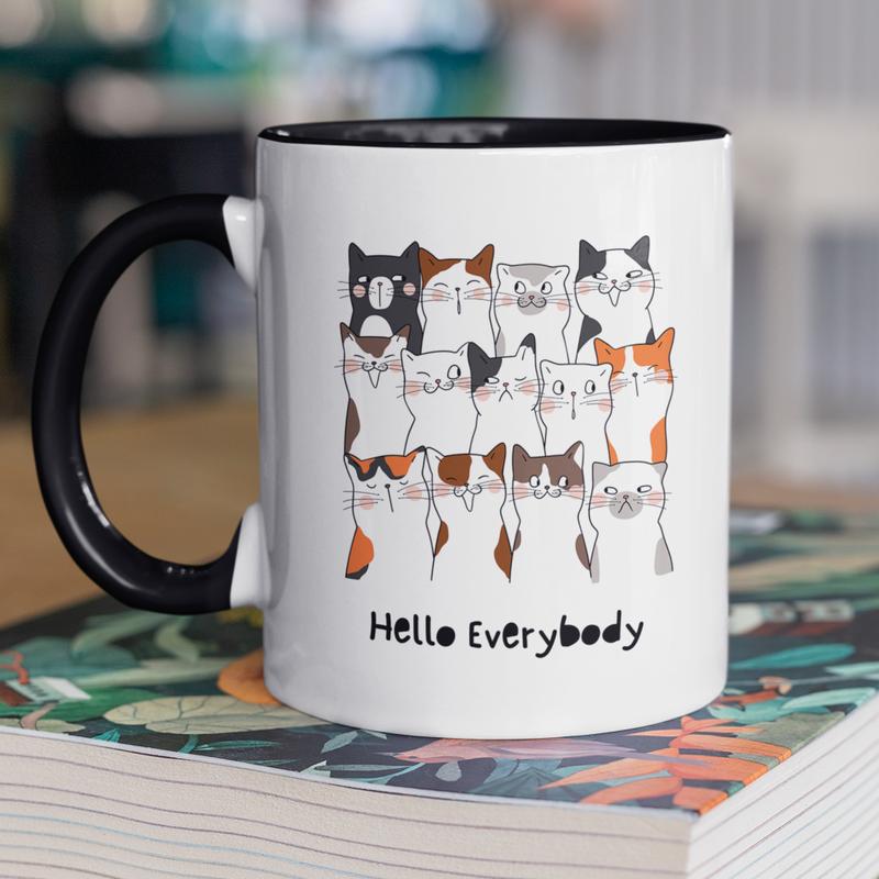 Чашка керамическая с принтом "cat hello" 330 мл, белая с черной ручкой