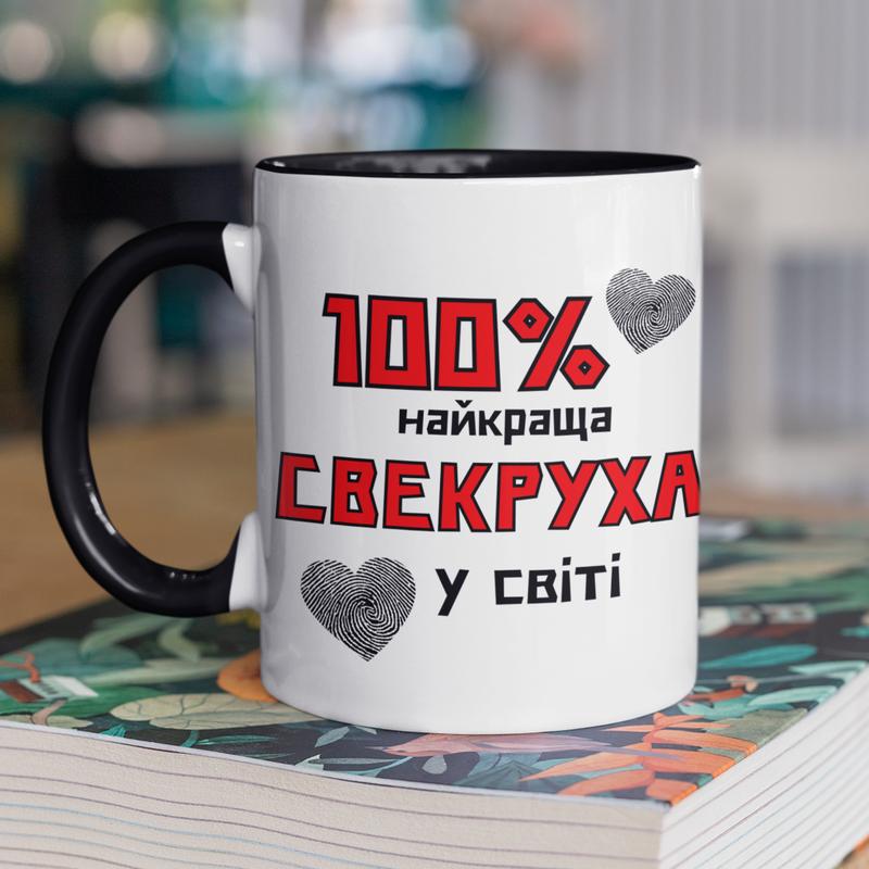 Чашка керамічна з принтом "100 % найкраща свекруха" 330 мл, біла з чорною ручкою