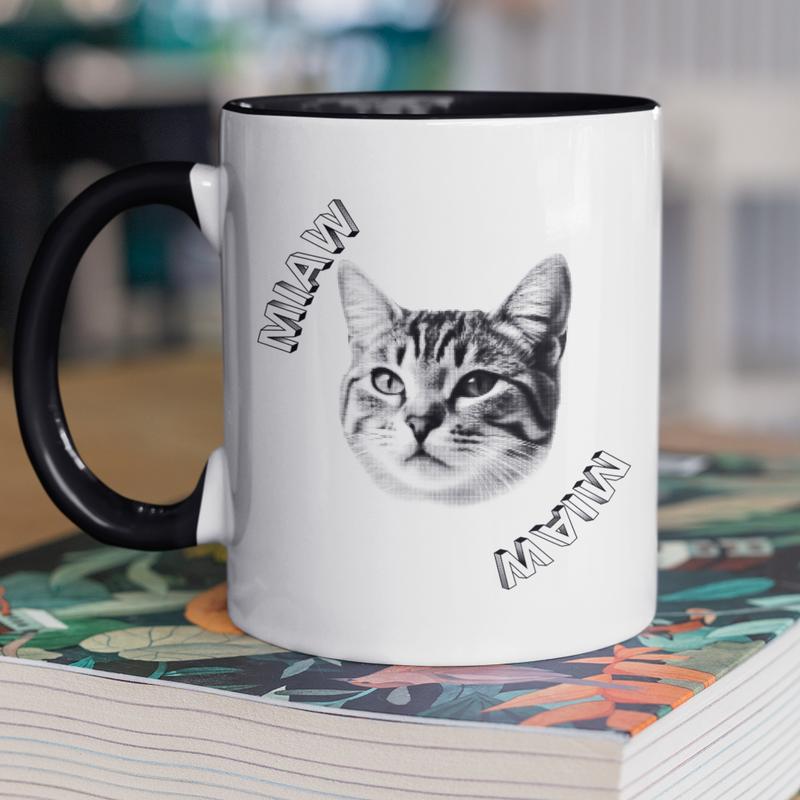 Чашка керамическая с принтом "miaw" 330 мл, белая с черной ручкой