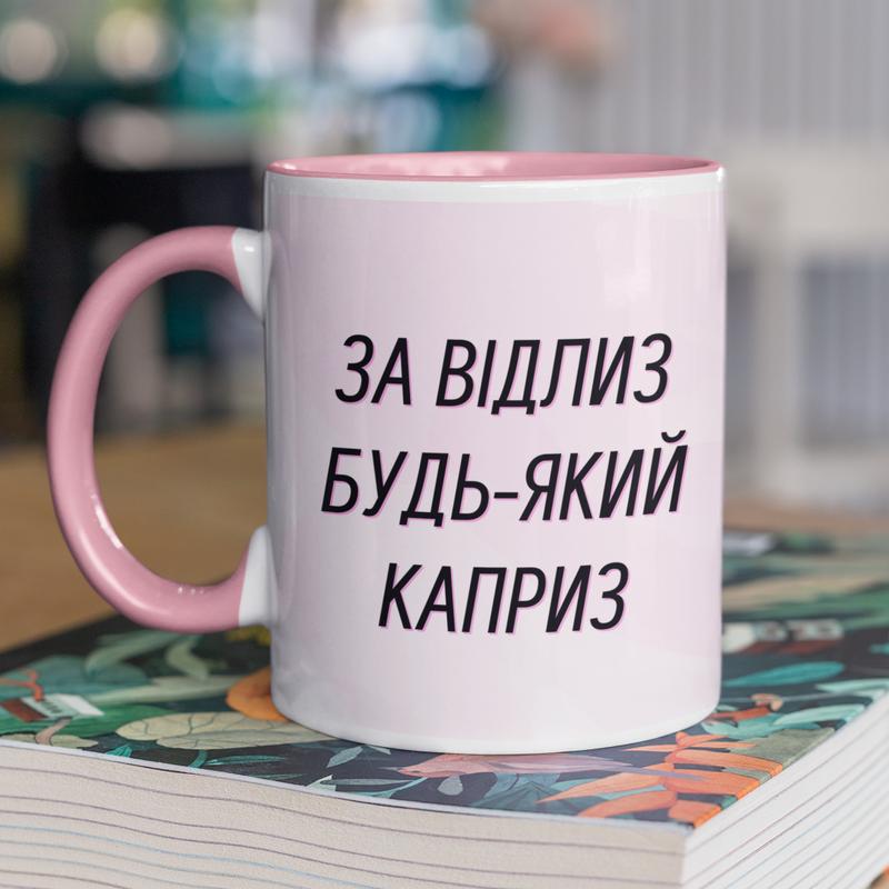 Чашка керамічна з принтом "за відлиз будь-який каприз" 330 мл, біла з рожевою ручкою