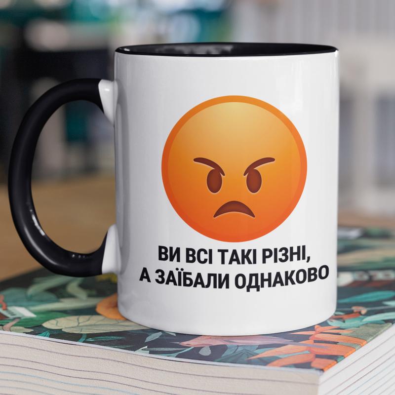 Чашка керамічна з принтом "ви всі такі різні а заїбали однаково" 330 мл, біла з чорною руч...