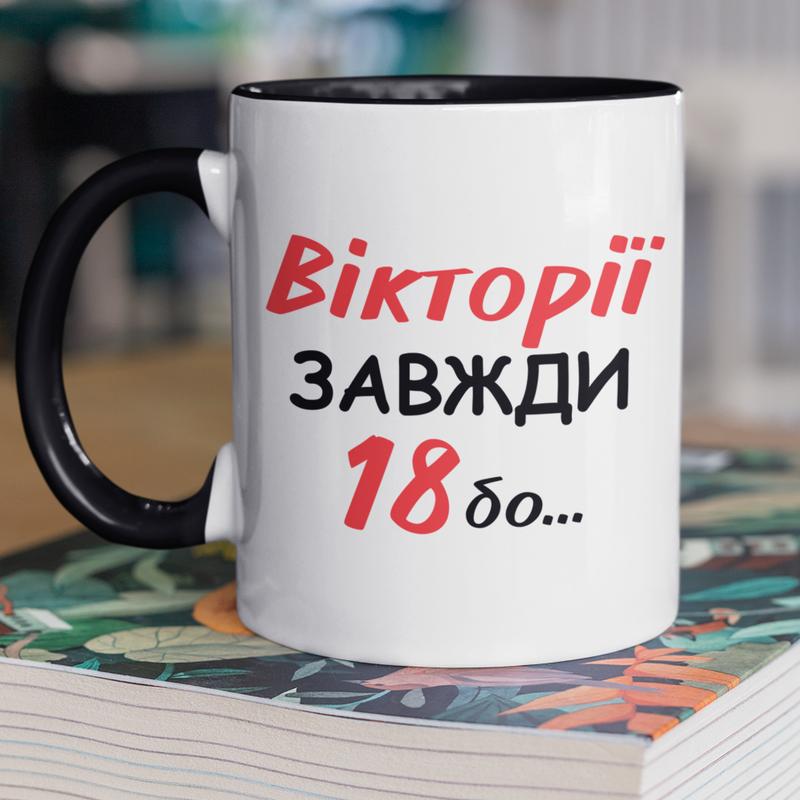 Чашка керамическая с принтом "виктории всегда 18" 330 мл, белая с черной ручкой