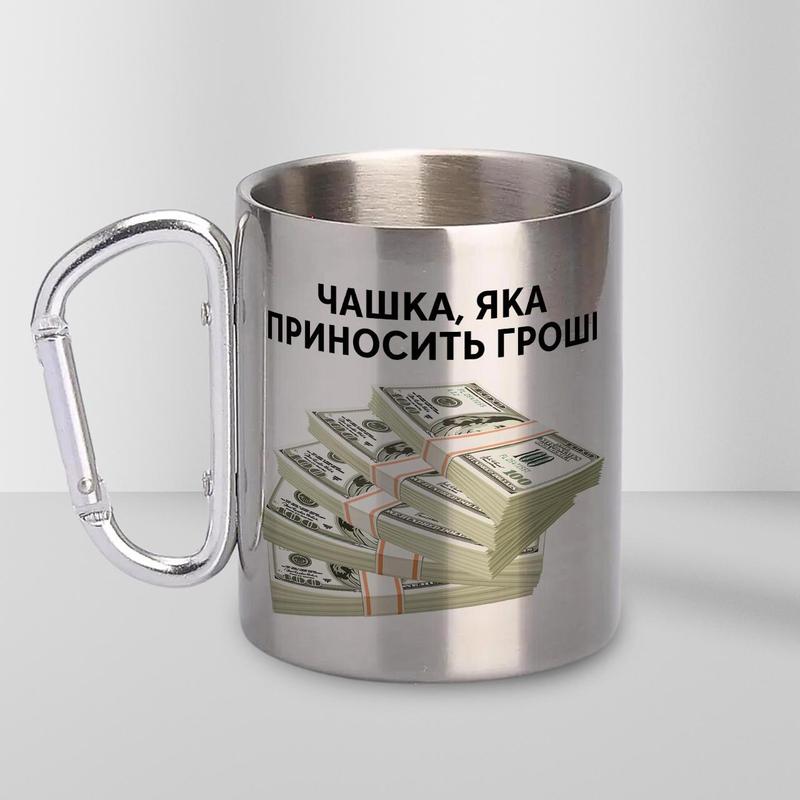 Кружка металева з карабіном "чашка яка приносить гроші" 300 мл срібляста