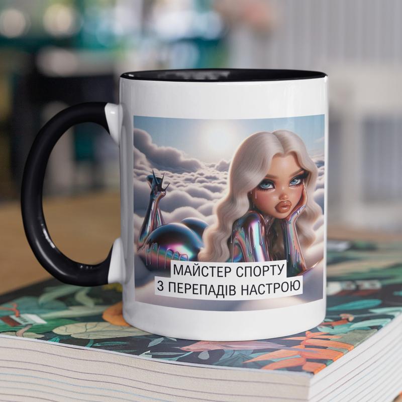 Чашка керамічна з принтом "майстер спорту з перепадів настрою" 330 мл, біла з чорною ручк...