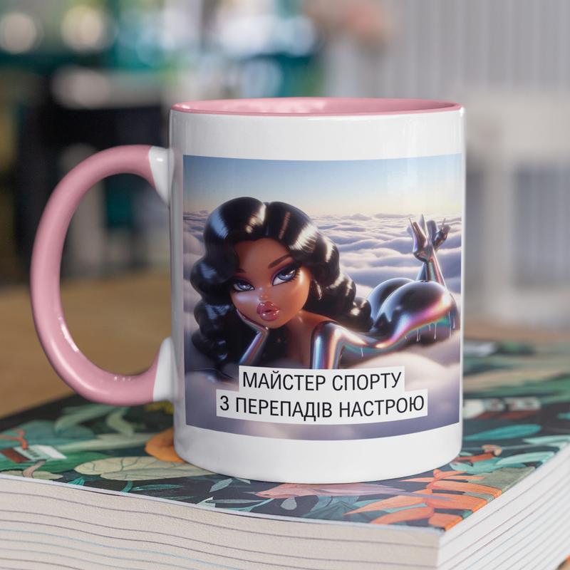 Чашка керамічна з принтом "майстер спорту з перепадів настрою" 330 мл, біла з рожевою руч...