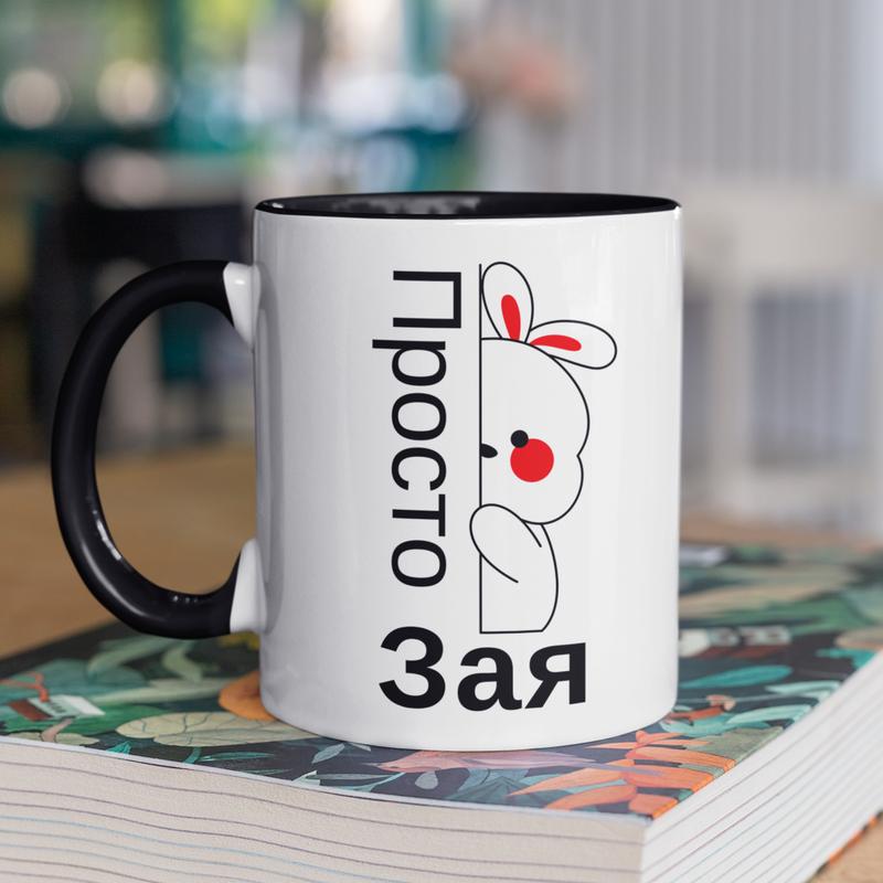 Чашка керамічна з принтом "просто зая" 330 мл, біла з чорною ручкою