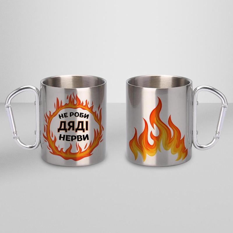 Чашка металлическая с принтом "не делай дяди нервы" 300 мл с карабином, серебристая