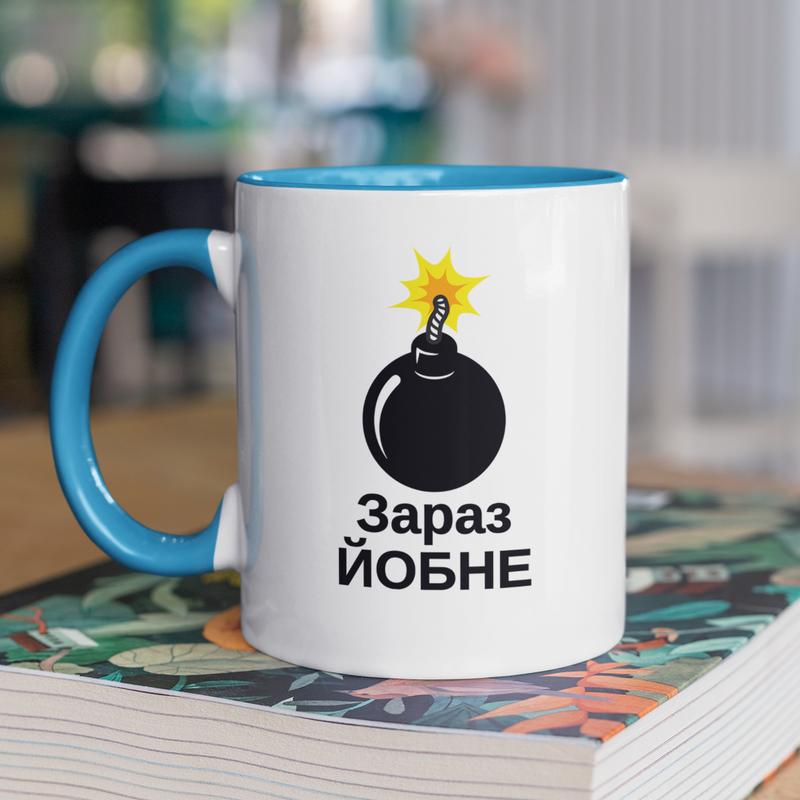Чашка керамічна з принтом "зараз йо*не" 330 мл, біла з блакитною ручкою