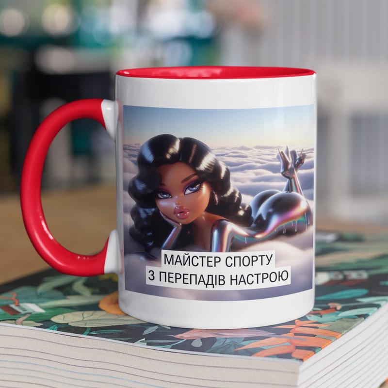 Чашка керамічна з принтом "майстер спорту з перепадів настрою" 330 мл, біла з червоною ру...