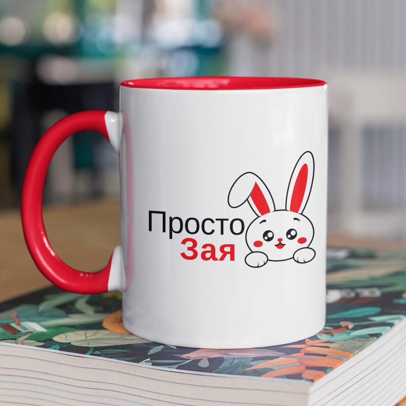 Чашка керамічна з принтом "просто зая" 330 мл, біла з червоною ручкою
