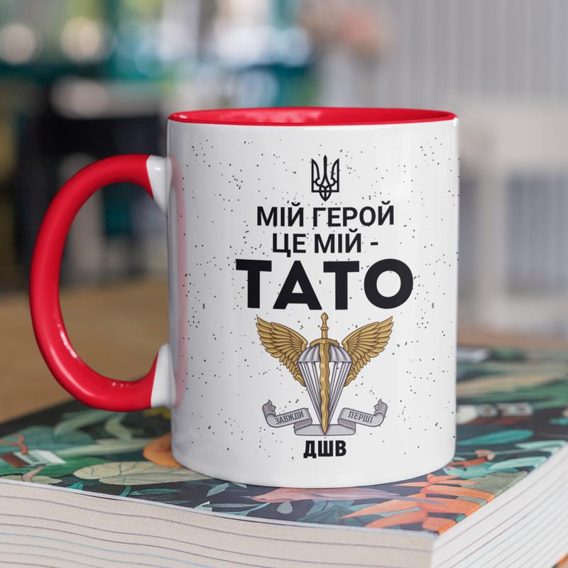 Чашка керамічна з принтом "мій герой це мій тато" 330 мл, біла з червоною ручкою