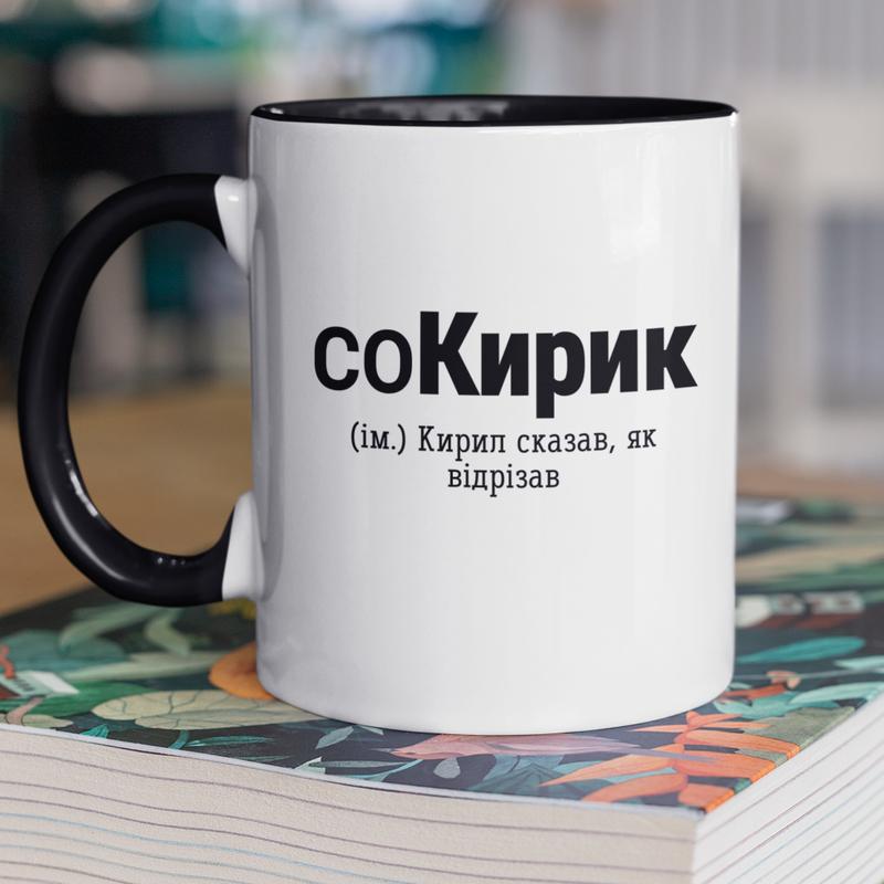 Чашка керамічна з принтом "сокирик" 330 мл, біла з чорною ручкою