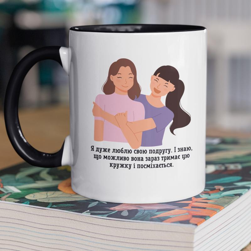 Чашка керамічна з принтом "я дуже люблю свою подругу" 330 мл, біла з чорною ручкою