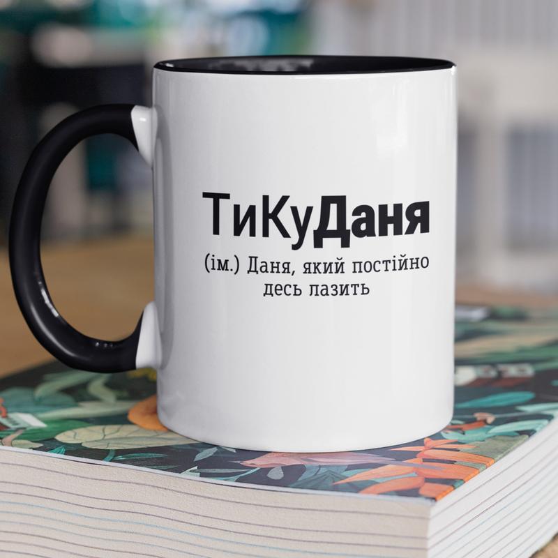 Чашка керамическая с принтом "тик даня" 330 мл, белая с черной ручкой