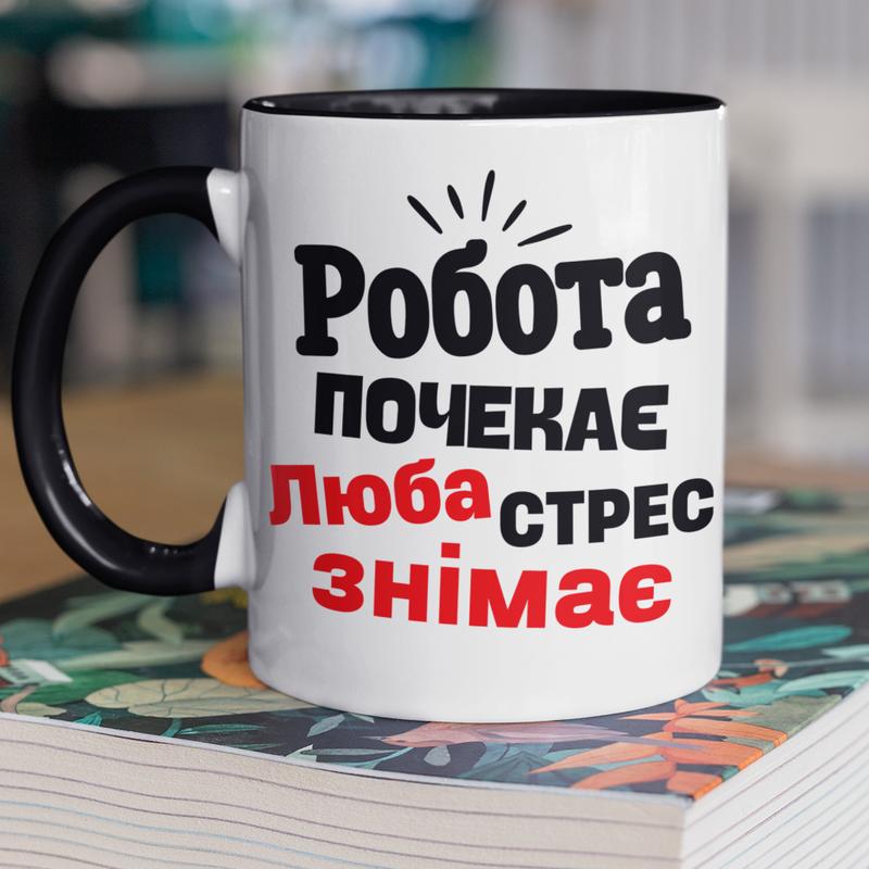 Чашка керамічна з принтом "люба стрес знімає" 330 мл, біла з чорною ручкою