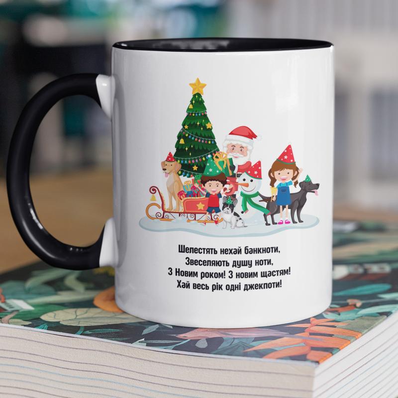 Чашка керамічна з принтом "новорічна" 330 мл, біла з чорною ручкою