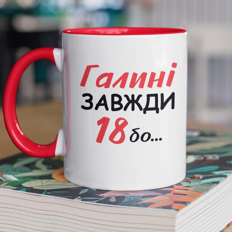 Чашка керамічна з принтом "галині завжди 18" 330 мл, біла з червоною ручкою