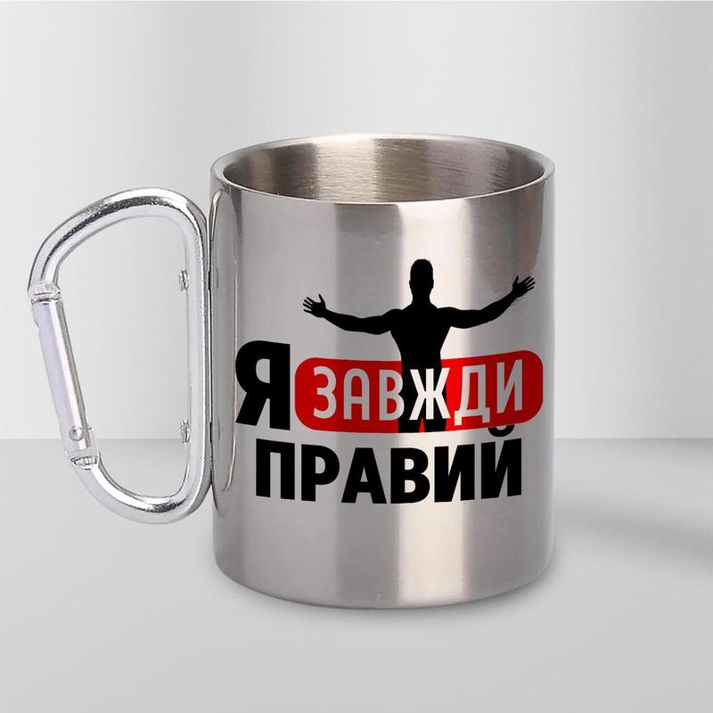 Чашка металлическая с принтом "я всегда правый" 300 мл с карабином, серебристая