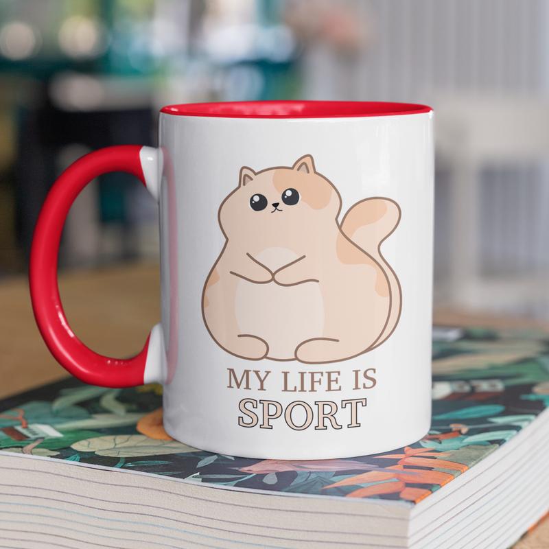 Чашка керамічна з принтом "my life is sport" 330 мл, біла з червоною ручкою