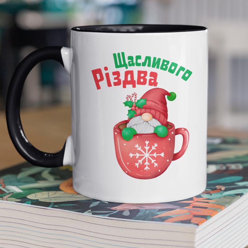 Чашка керамическая с принтом "счастливого рождества" 330 мл, белая с черной ручкой