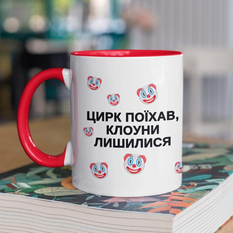 Чашка керамічна з принтом "цирк поїхав клоуни лишилися" 330 мл, біла з червоною ручкою
