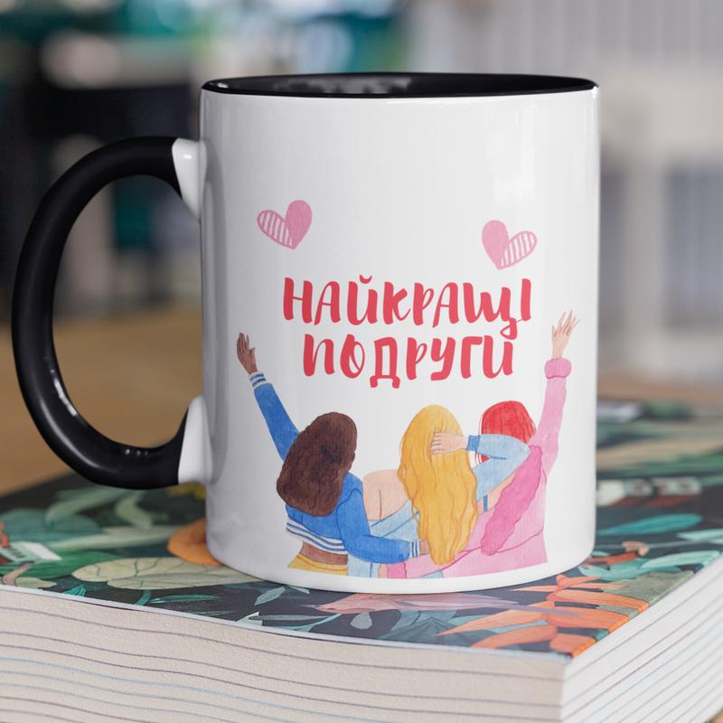 Чашка керамическая с принтом "лучшие подруги" 330 мл, белая с черной ручкой