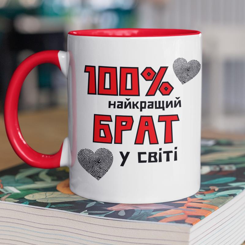 Чашка керамічна з принтом "100 найкращий брат" 330 мл, біла з червоною ручкою