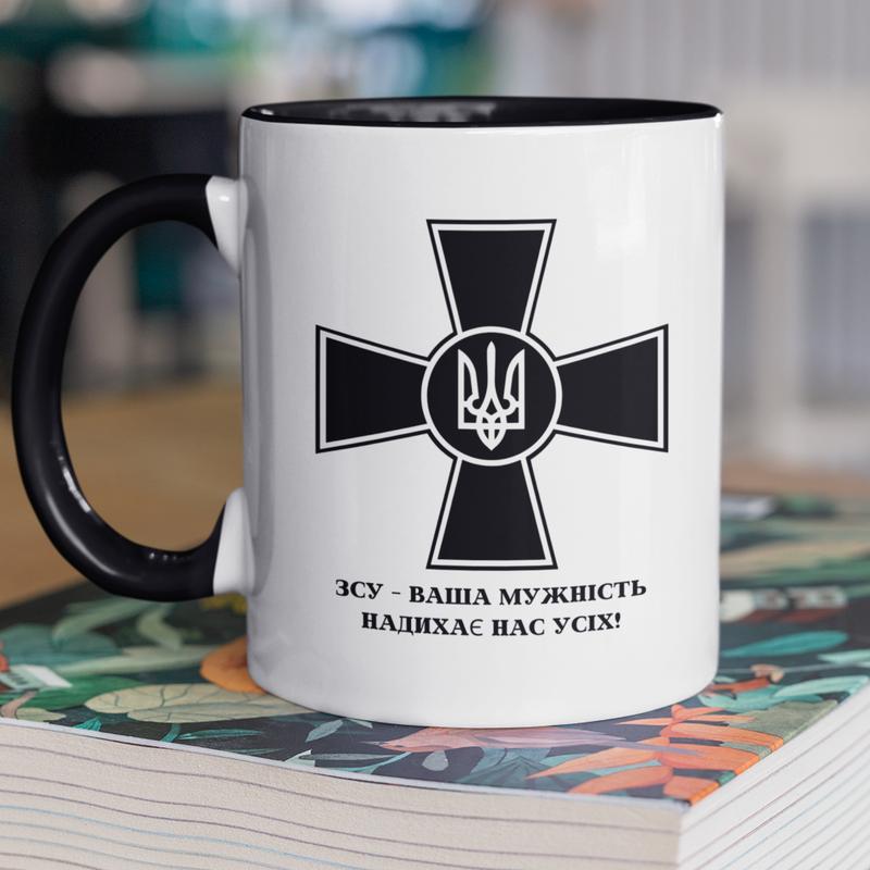 Чашка керамічна з принтом "зсу мужність" 330 мл, біла з чорною ручкою