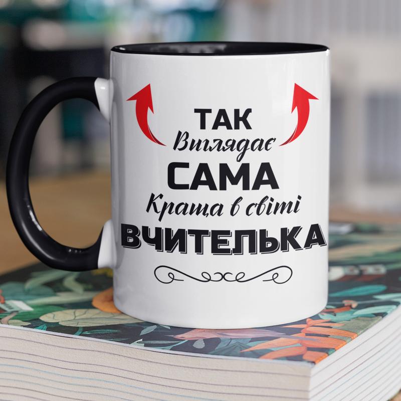 Чашка керамічна з принтом "так виглядає сама краща в світі вчителька" 330 мл, біла з чорно...
