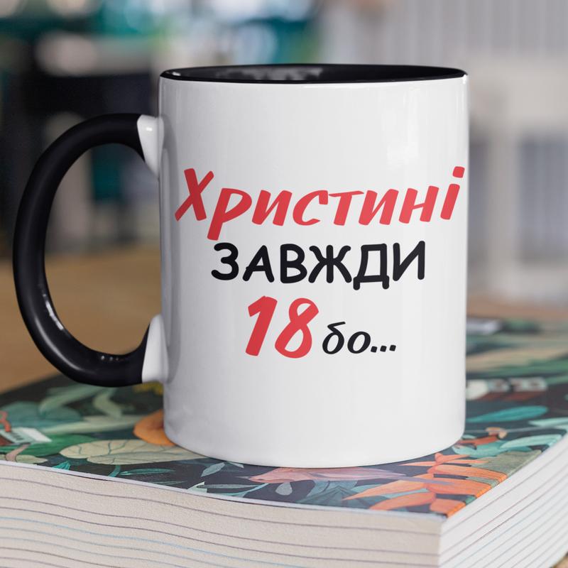 Чашка керамическая с принтом "христини всегда 18" 330 мл, белая с черной ручкой
