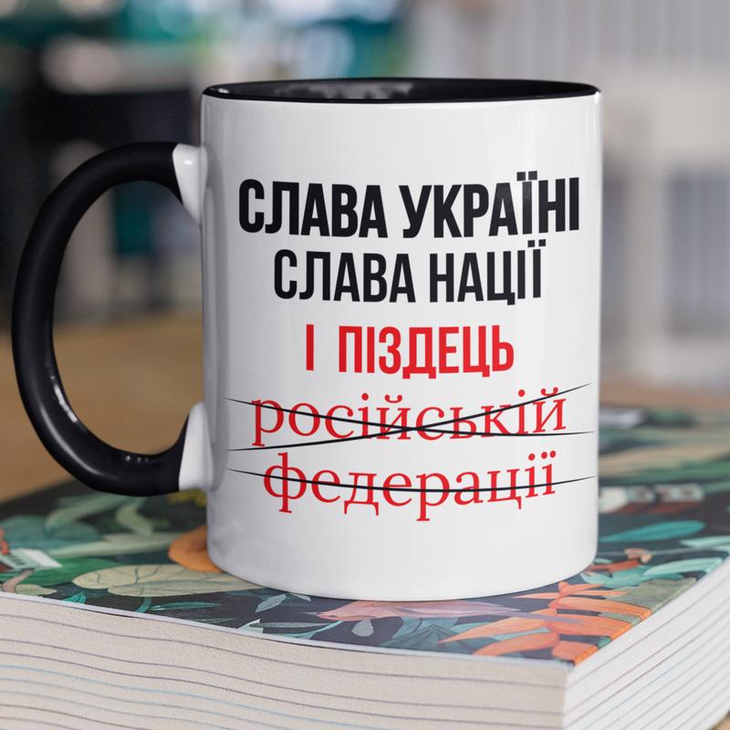 Чашка керамическая с принтом "слава украине слава нации" 330 мл, белая с черной ручкой